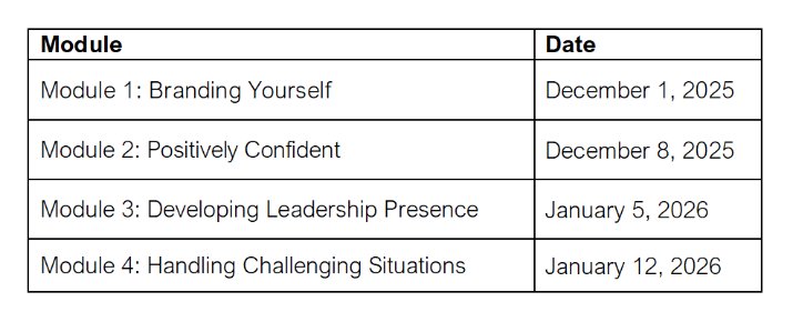 Module 4: Handling Challenging Situations – As women, we are often faced with situations where we must assert ourselves. It might be asking for a promotion, being heard at a meeting, delivering a tough performance review, or saying no to non-value-add activities. This module will provide participants with the skills to present themselves as confident leaders in all these situations and more.